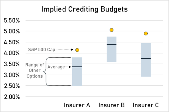 Most FIAs offer multiple indexed account options, whether it be different indices, different crediting methods, or different crediting terms, and this adds another wrinkle to the carrier’s rate setting decisions. The crediting budget we described above represents the total the carrier can spend on a block of new business. But how does that get apportioned out to each indexed account? One approach is to divide it up evenly—that is, target the same crediting budget for every indexed account. Another approach is to spend more on some options and less on others, such that the weighted average across options aligns with the aggregate crediting budget. This idea is precisely what we mean by “subsidization”. What does this look like in practice? Let’s walk through an example.
