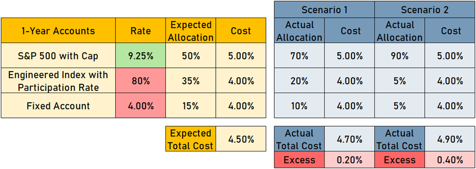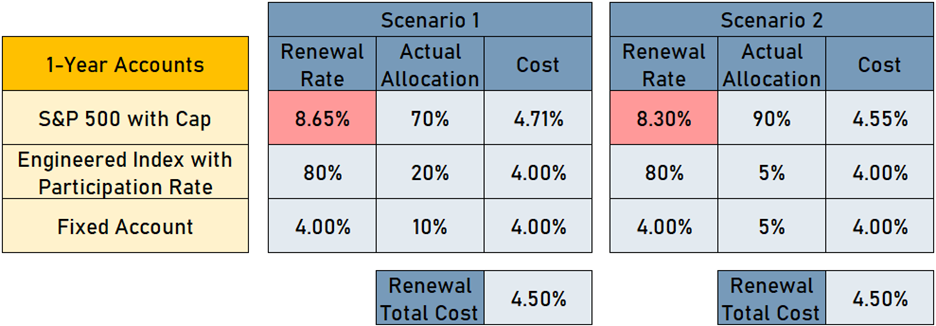 By pushing more of their pricing power into a competitive S&P 500 cap, Aspiring Life could very well see more premium deposited into that account than originally expected. If that happens, the financial ramifications could push their otherwise profitable FIA underwater. Below, consider two hypothetical scenarios where increased allocations to the more competitive S&P 500 cap lead to additional spending on the underlying options used to hedge that account.