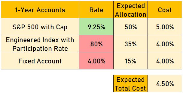 Just like a host of fellow insurers in the space, Aspiring Life can make the decision to increase the S&P 500 cap account and decrease their other accounts to make up for it. Fair or not, sales in the accumulation-focused FIA space are driven mainly by the competitiveness of a carrier’s S&P 500 cap. Rates on engineered indices are not as heavily commoditized, due in part to the diversity of index options in the industry and inability to compare apples to apples. If the company’s assumed sales mix is right, they can expect to see the same aggregate cost emerge from the product. Aspiring Life decides not to go so far as to push themselves to the very top of the S&P 500 cap leaderboard for their initial launch, but with a little bit of subsidization magic, they are still able to significantly shrink the gap between the 8.25% cap that their initial pricing suggested and the 10.00% cap offered by Aggressive Life.
