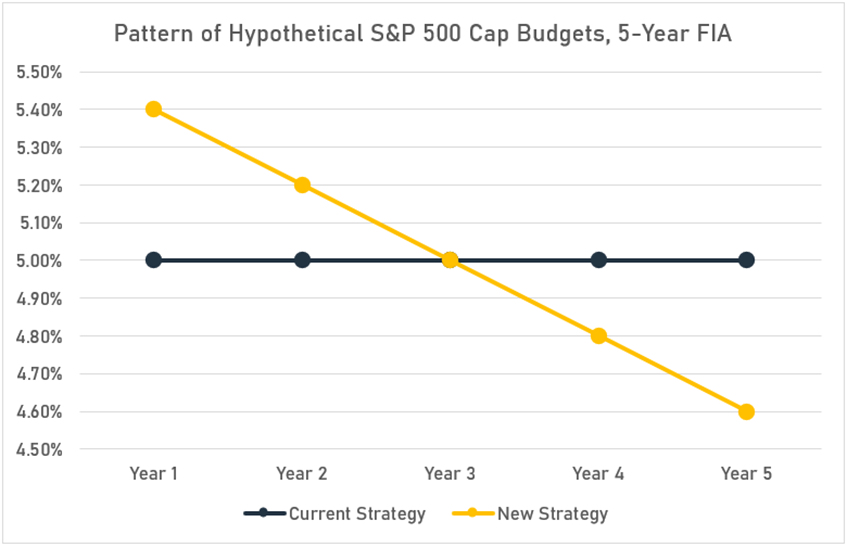 The new proposal, on the other hand, leans into the assumption that minor year-over-year reductions in the cap will be tolerated. Over the five-year period, the average assumed crediting budget is nearly the same as under the current strategy, but under the new strategy, Aspiring Life employs planned renewal rate decreases to subsidize the initial cap. The decline is subtle, resulting in yearly cap reductions of no more than 0.50% if the option pricing dynamics hold. But over the course of the five-year period, the renewal caps would drop by over 1.50%, down well below the 5th-year S&P 500 cap that would be supported by the current strategy. Here’s how those hypothetical S&P 500 caps shake out, assuming stable option pricing dynamics throughout the five-year projection: