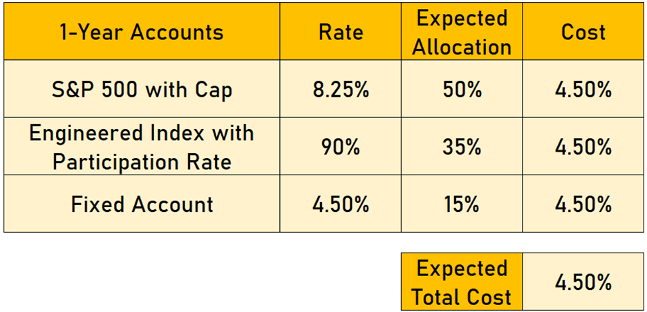 Aspiring Life begins working through their rate setting strategy in preparation for their upcoming launch. To keep things simple and straightforward, Aspiring Life determines target crediting rates for each of their three accounts based on the same 4.50% crediting budget. By spending the same amount on each of their three accounts, Aspiring Life would expect to pay 4.50% to support the rates on the product no matter where their customers allocate their premium—an appealing result for a new entrant with no live experience to use to make a confident allocation assumption.